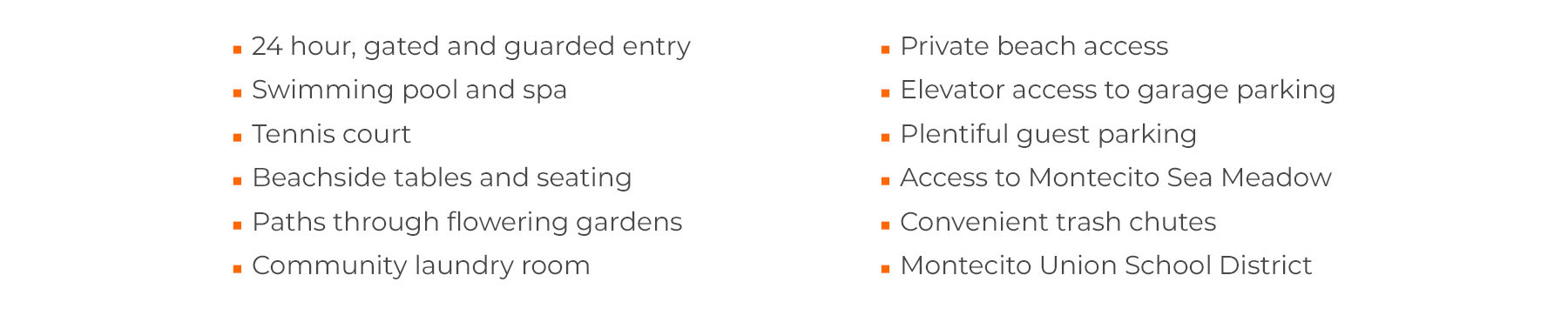 Montecito Shores amenities include direct access to world class beaches, beachside seating areas, pool, spa and tennis.