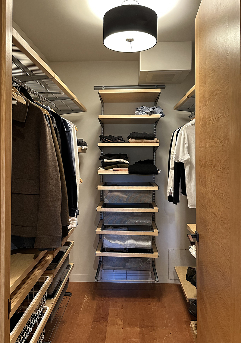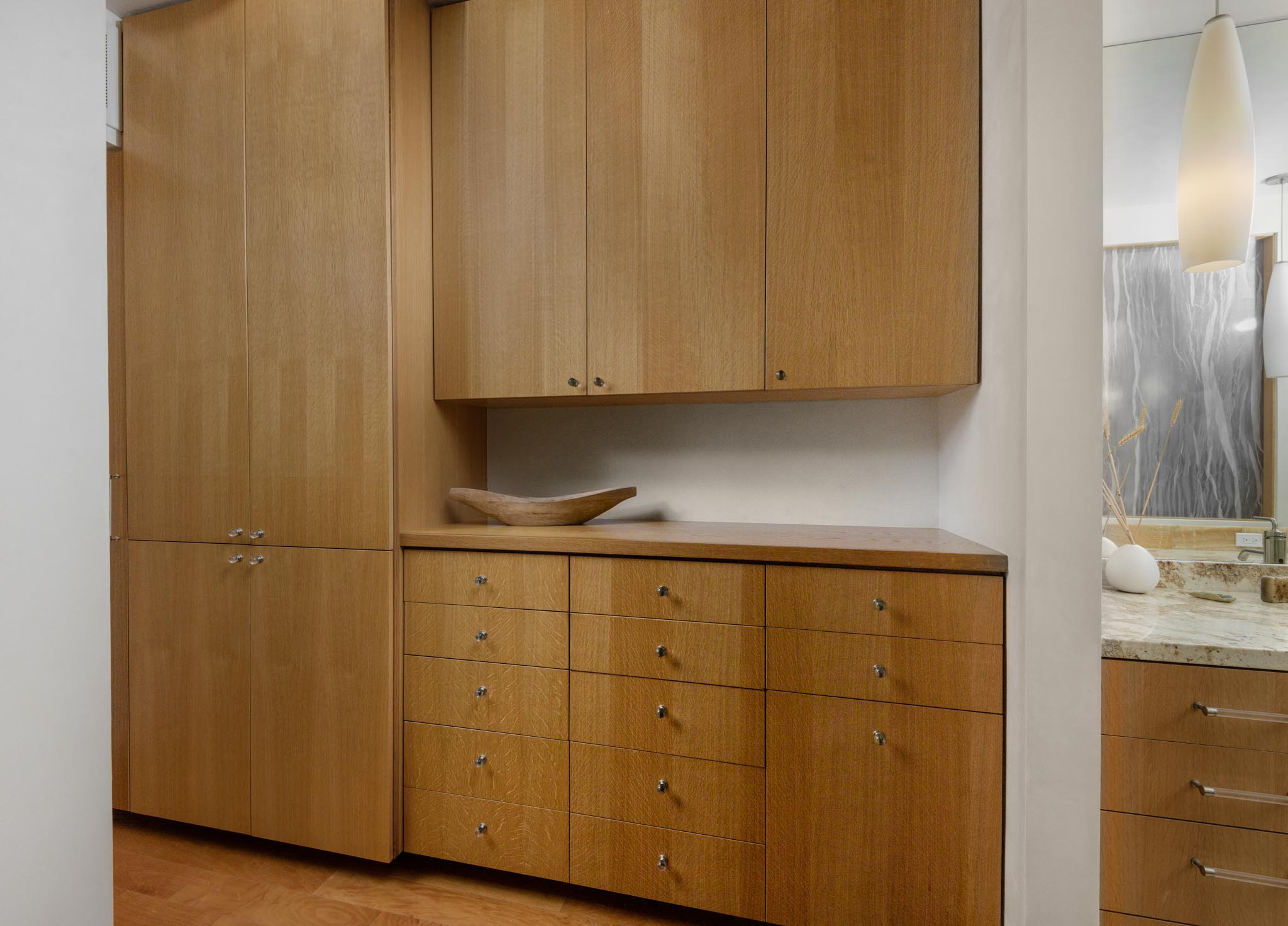 The primary suite has abundant custom White Oak built-in storage and a luxurious en suite bathroom with oversized shower in honey onyx and soaking tub with jets.